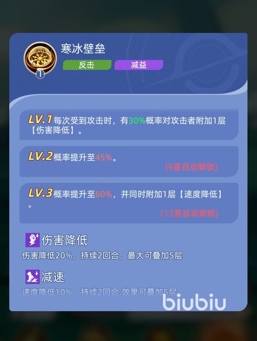 第二个技能是在每回合开始时,如果自身生命值在50%以下,那么最多能恢复10%的最大生命值。这样作为一名坦克,自身也有了治疗能力,再配合上团队中的其他奶妈就能吸收更多的伤害,即使在奶妈阵亡之后也能自我进行恢复。第三个技能寒冰壁垒,在每次受到攻击时,都有几率对攻击者施加一层伤害降低效果,提升技能等级后,还可以同时在附加一层速度降低。这样对方无论是输出还是速度都会受到很大的影响,这两种效果最多都能够叠加到5层。只要能够叠加起来,对方的输出就会大幅度下降,同时减速之后我方也能更快出手。
