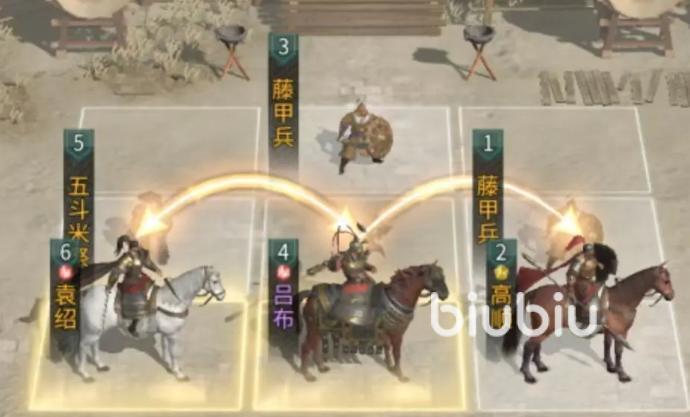 这套阵容的站位是很讲究的,高顺、吕布、袁绍都放在第三排,为的就是规避当前版本中大量优先攻击中排、上排的输出机制。虽然这样会导致吕布的出手稍微慢一点,但生存却极大提升了,只要核心不被秒了,后续输出就是源源不断。