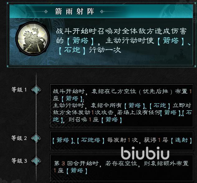 袁绍,则是整套体系的灵魂,通过不断的召唤箭塔和石炮稳定制造范围伤害和控制效果,从而为吕布创造理想的输出环境。袁绍的天赋“箭雨射阵”在战斗初始就可以占据优势,开局在己方空位布置箭塔,每个大回合开始,箭塔都会对敌方全体造成伤害,并且该伤害还会受统率属性影响。这样就意味着袁绍并不需要频繁的站在前线打直伤,也能稳定压低敌方的血线。当袁绍主动行动的时候,则可以让箭塔和石炮额外行动一次,如果可以叠加“连射”效果,那么箭塔的整体输出在中后期就会非常可观。