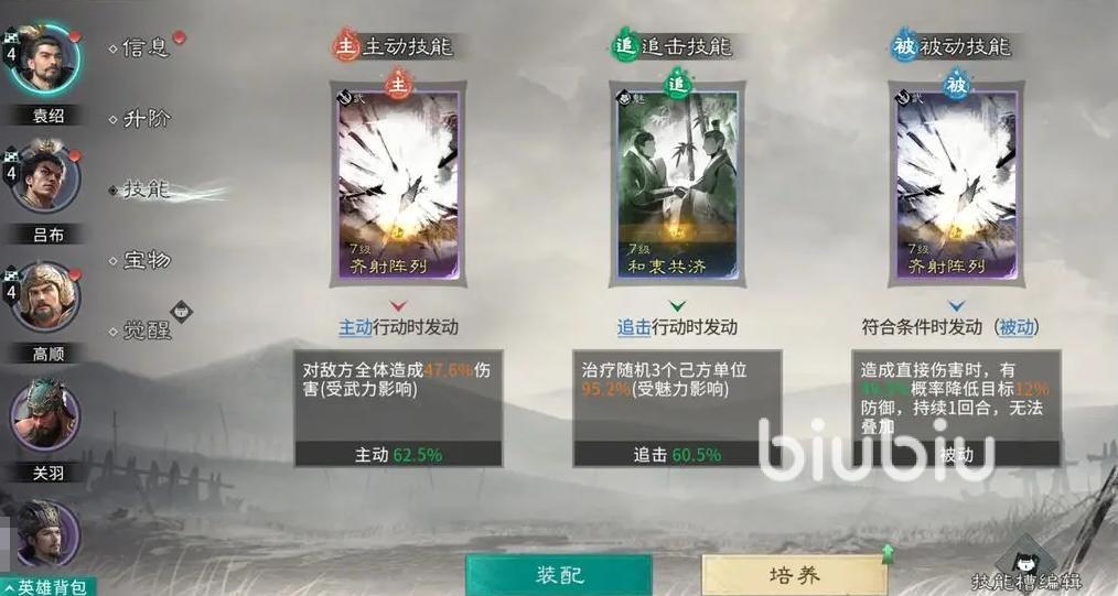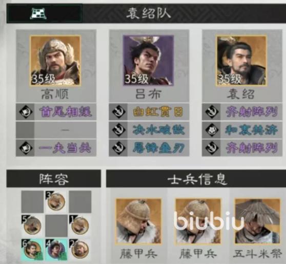 高顺被动用“一夫当关”,牺牲输出来换取坦度,主动技用“首尾相援”为全队提供恢复和减伤,让整体的防线更稳。吕布主动技“白虹贯日”,锁定敌方后排核心,解决对方C位或者关键辅助,追击技“决水破敌”,群伤加虚弱,被动“层锋叠刃”,每回合叠加无视防御,后期伤害爆发。袁绍主动和被动都带“齐射阵列”,被动带“和衷共济”,前者有效压血,被动则概率减防,后者随机治疗3单位。