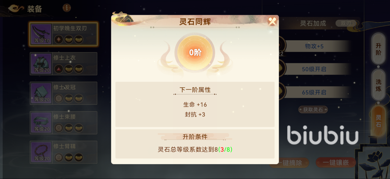 灵石同辉的加成效果和阶级相关,阶级的提升需要玩家通过提升灵石的等级来达成。在镶嵌一颗灵石的情况下是很实现升阶要求的,最好是开启了两个灵石卡槽之后再来注重灵石同辉阶级的提升。