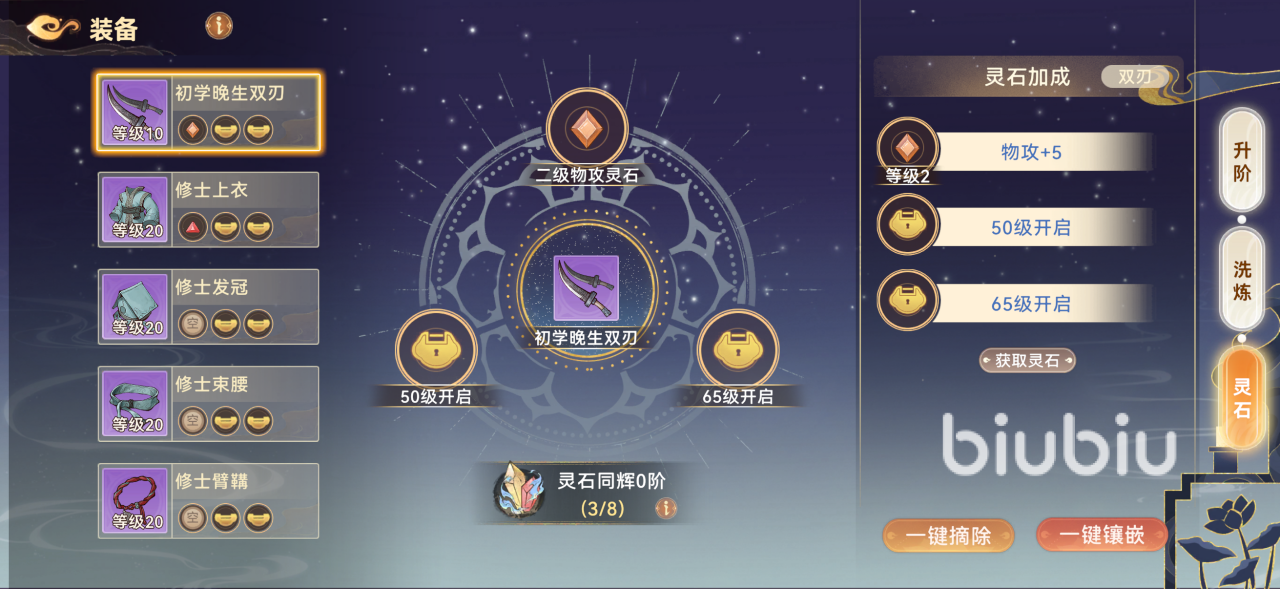 游戏中的很多玩法是需要到达一定等级后才能解锁的,特别是到了30级之后,玩法更是多样。当玩家获得了装备之后能通过洗炼、升阶等来提升战力加成,同时也可以通过装配灵石来加强灵石同辉的效果。在灵石上有不同属性颜色的灵石和品阶,一个武器最多可以装备3个灵石,灵石卡槽通过升级来解锁。