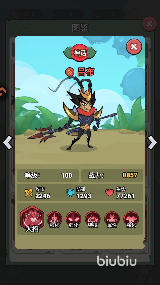吕布:无双蝗神;可使用技能“无双形态”,让角色瞬间蜕变成远程蝗神形态,射程提高605%,普攻伤害增强55%,持续6秒,这是个擅长远距离输出的战神,射程非常远,能在安全距离对敌人实现超强打击。