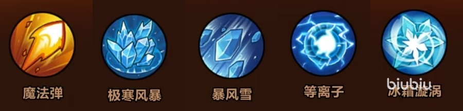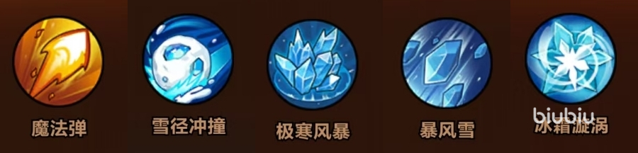 技能选择:魔法弹+雪径冲撞+极寒风暴+暴风雪+冰霜漩涡