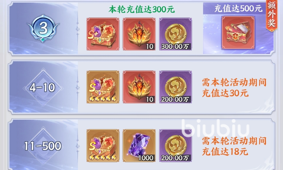 活动期间充值达到18元后可参与排名比拼,若能进入前500名便可拿到排名奖励,排名越靠前,奖励越丰厚。