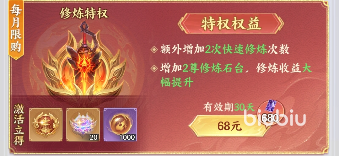 修炼特权(68元)购买后效果持续一个月,能额外获得2次快速修炼次数,还可立刻获得2尊石台,提高修炼收益。另外,购买后能拿到1枚【结盟誓令】、20枚【征召玉兆】和1000枚【破境丹】,额外还送680【紫晶卡】,性价比非常高。