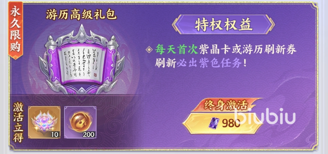 游历高级礼包特权(980紫晶卡),购买后每天首次刷新游历任务必出紫色品质的任务。购买还送10枚【征召玉兆】和200枚【破境丹】。刷出9次带紫晶卡的紫色游历后就能回本,推荐所有玩家优先购买。