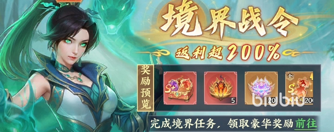 境界功能专属战令,提升境界等级便可领取奖励,可获得【征召玉兆】、【结盟誓令】、【斗者碎片】、【斗魂宝箱】、【S+斗者自选箱】等,战令玩家、冲榜大佬、霸服大佬必买。