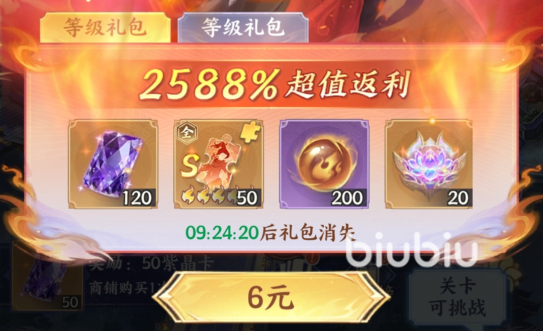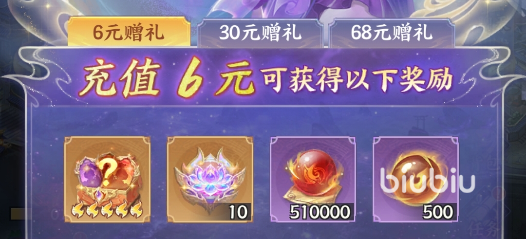 每日累计充值金额达到阶段目标后,可领取不同档位的充值礼包,它共有6元、30元和68元三个档位,性价比不错。