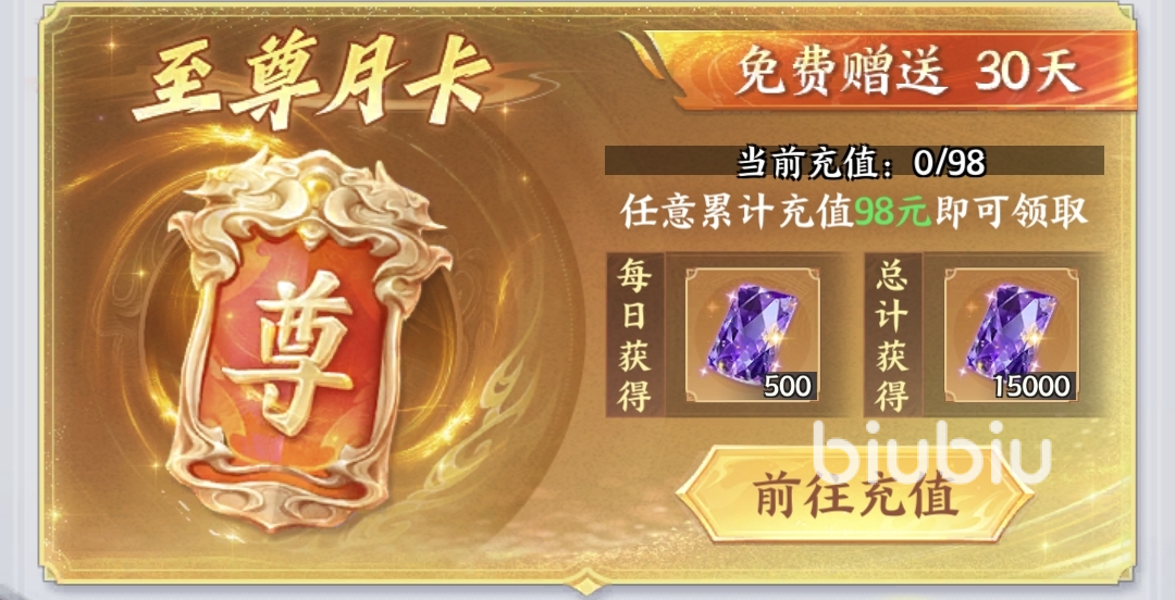 累充达到98元便可激活,激活后每日能获得500张【紫晶卡】,持续30天,共计能拿到15000张【紫晶卡】。建议同时购买招募特权和修炼特权来激活月卡。