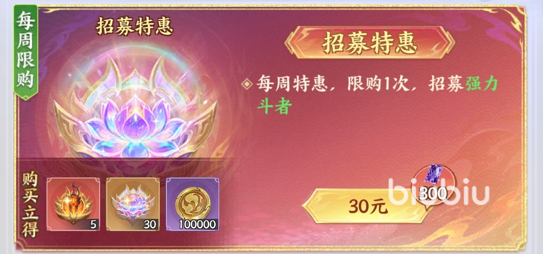 招募特权(30元)购买后效果持续一周,每周限购一次,可让各位更快地招募出强力斗者,还能拿到5枚【结盟誓令】和30枚【征召玉兆】,额外还送300【紫晶卡】,必买。