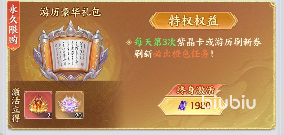 游历豪华礼包特权(1980紫晶卡),购买后每天第3次刷新游历任务,必出橙色品质任务,不管是使用【紫晶卡】还是游历刷新券都是如此。购买还送2枚【结盟誓令】和20枚【征召玉兆】。游历豪华礼包与游历高级礼包互为独立特权,推荐所有玩家优先购买。首充玩家、月卡玩家可在购买了游历高级礼包后购买,刷出7次带紫晶卡的金色游历后便可回本,资源充足的玩家可与游历高级礼包一并购买。