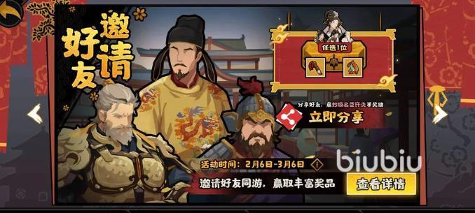 新增的社交玩法,完成邀请目标就可以获得妙级名臣自选宝箱,包含许负、许慎、桓伊、伯牙、子期在内的多位功能性名臣可供选择,对于阵容尚未成型的玩家来说非常友好。