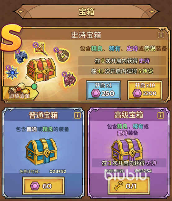 宝箱/抽卡:游戏商店中有各种宝箱(普通、高级、史诗)用钻石进行抽取。这是获得高品质(橙、红)装备和完整套装的主要途径之一。