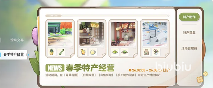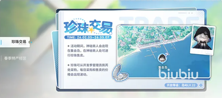 本次特产经营活动中,佩芮将发出特产订单,完成订单就能获得开放及TP奖励,完成开发计划获得岛屿角色养成材料,还有星彩券的奖励;还有全新玩法上线,可以一百年去海边星守休闲钓鱼时光,参与“珍珠交易”。