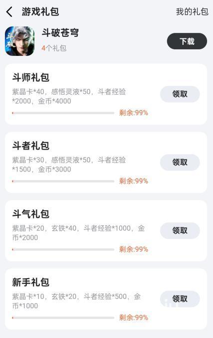 如图所示,下载安装九游app后,注册登录,输入“斗破苍穹”,找到对应专题,就可以看到福利一栏中有许多可领取的礼包,包含斗师礼包、斗者礼包、斗气礼包、以及新手礼包,目前有很多余量抓紧领取吧!