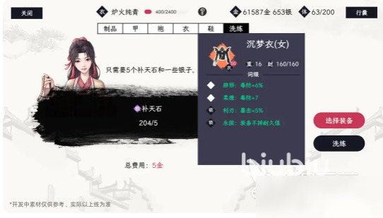 洗练需要先找到裁缝铺,或者是铁匠铺,这里有一个角色可以帮助大家重新打造装备的,因为游戏一开始设定的装备词条都是随机配置的,所以装备所能带来的攻击力,防御性甚至是法控性自然是没有那么理想。 开始洗炼的装备,就代表着大家可以修改一些参数,不过需要消耗5个补天石加上一些银子。