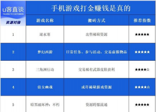 目前市面上,能赚钱的手游,大概有几类,第一类是大型多人在线游戏,这类游戏玩家多,经济系统成熟,比如你可以打装备,然后卖给其他玩家,或者帮人代练等级,赚取服务费,不过竞争也很激烈,需要你对游戏很熟悉。