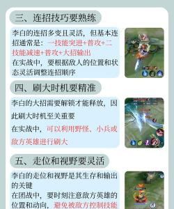 玩李白,前期以发育为主,多刷野怪,快速到达四级,有了大招,就可以找机会抓人,利用一技能两段位移,接近敌人,刷出大招后,直接释放,然后回到安全位置,团战中,后手进场,瞄准敌方后排,一套技能打完,立刻撤离,等待下次机会。