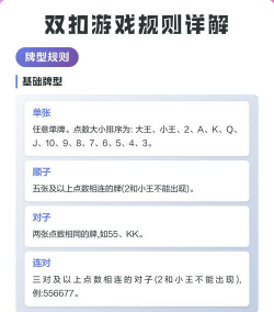 这是玩双扣的基础,牌的大小顺序是固定的,大王最大,小王次之,然后是2、A、K、Q、J、10,一直到3最小,但要注意,在双扣里,2是常主,它比A大,但比王小,除了比较单张,还要懂组合牌型,比如对子,就是对两张点数一样的牌,三张就是三张一样的,顺子则是五张或以上,点数连续的牌,比如3、4、5、6、7,这些牌型之间,一般不能互相压制,也就是说,对子只能管对子,顺子只能管顺子。