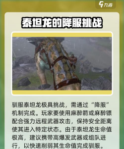 泰坦龙无法用常规方式驯服,不能喂食,也不能打晕,正确方法是,攻击它背上的腐化瘤,你需要先把它引进困龙房,然后站在安全位置,用火炮,或者火箭筒,瞄准那些紫色肿瘤,持续攻击,直到所有肿瘤被清除,它就会进入驯服状态,这个过程很耗弹药,记得多带一些。