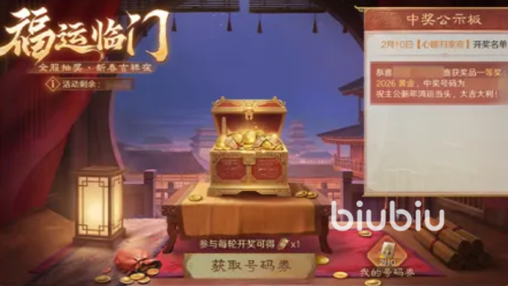 2月10日到3月3日主公可以在百戏游园、元夕灯谜中获取抽奖卷,只要有卷就会被视为参与福运临门玩法,2月17、2月21、24日和3月3日会公布中奖号码,最高能拿到2026黄金奖励。