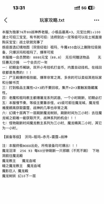 最后是资源积累新区资源,非常宝贵,金币,元宝,装备材料,都要精打细算,日常任务,可以赚金币,充值活动,能拿元宝,打BOSS,掉好装备,还有材料,记住,前期资源,别乱花,留着后期,提升战力。