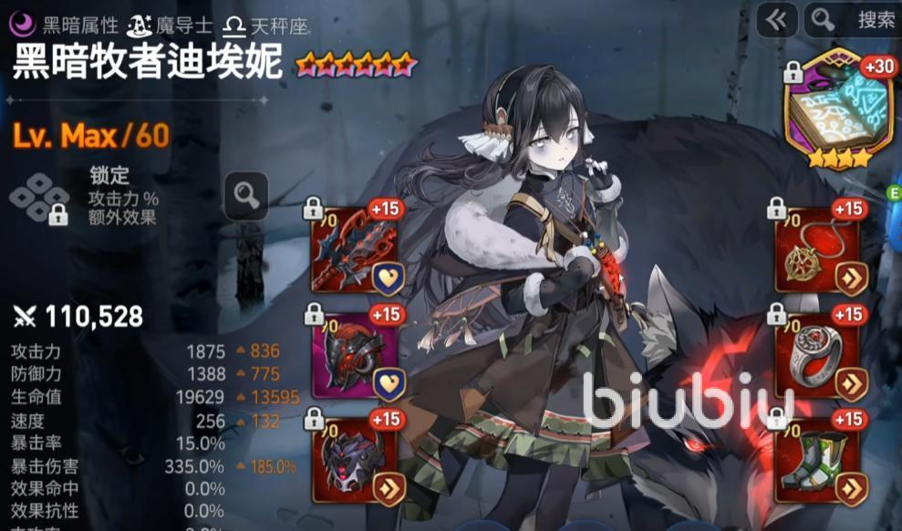 装备一般是4件套用速度套,2件套用生命套。面板速度最好是在240+,防御1200+,血量2万3+,暴伤270+,效果命中100+。需要较高的速度来确保2技能触发后不被插队,以及轮转效果。