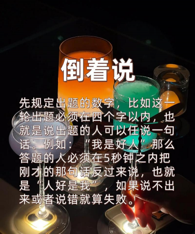 如果不想太费神,只想轻松聊天,那也有适合的游戏,比如成语接龙,或者歌词接龙,接不上的人,自然要喝一杯,这些游戏节奏慢,压力小,很适合边喝边聊,另外,你还可以玩些小道具游戏,比如转酒瓶,瓶口指向谁,谁就完成任务或喝酒,简单直接,效果却很好。