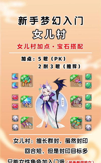 先看加点方案,这是核心,女儿村加点,主要有三种思路,第一种是高速封系,这种加点,追求速度,属性全敏,装备也选敏捷,这样出手快,能先手控制,在PK中很关键,不过,生存能力弱,需要队友保护。