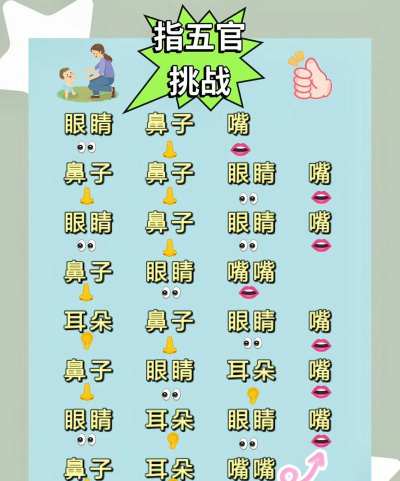 再看基础玩法,你可以先说“鼻子”,然后,孩子要快速指自己的鼻子,接着,你说“耳朵”,他就指耳朵,这样轮流下去,速度可以时快时慢,增加趣味性,当然,你也可以让孩子来发指令,你来指,这样角色互换,孩子会更投入。