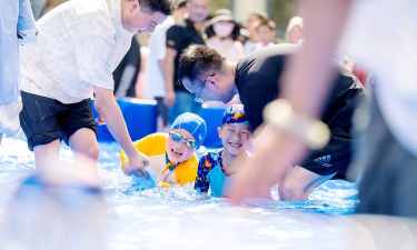 再看水中接力赛如果泳池人不多,空间足够,可以玩接力赛,把家人或朋友分成两队,每队站在泳池的两端,然后,用浮板或者游泳圈作为接力棒,队员需要游到对岸,把“接力棒”交给下一个人,这个游戏,能很好地锻炼游泳技巧,和团队协作能力,如果孩子还不会游泳,可以让他们,套着游泳圈进行,或者,改成在水里行走的接力,同样很有趣。