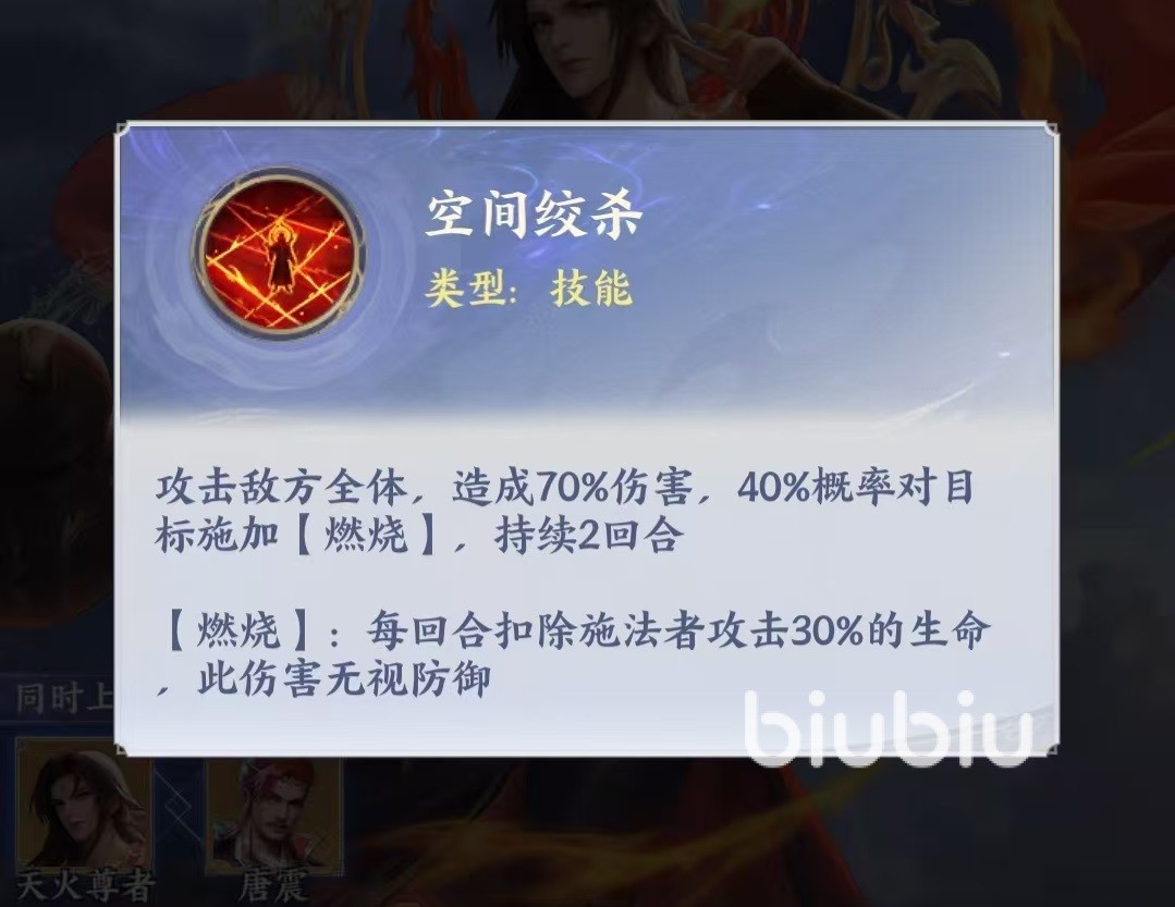 天火尊者的技能是空间绞杀,攻击对方全体,除了造成一次伤害外,还有几率对目标施加燃烧,持续两回合。燃烧效果是每回合可按照施法者30%的攻击力扣除生命值。扣除时无视防御。相信通过这个技能大家就可以看出天火尊者就是阵容中的灼烧核心。在升星之后可以获得额外特性,在红四星时,释放普攻有几率为目标添加燃烧状态,持续两回合,继续提升灼烧的触发手段。白金一星时,只要天火尊者在场,所有燃烧伤害增加20%。白金三星时,敌人获得燃烧状态时,如果已处于燃烧状态,则获得额外伤害。粉彩一星时,敌方单位的灼烧状态消失或者是被驱散时,会蔓延到相邻目标身上。