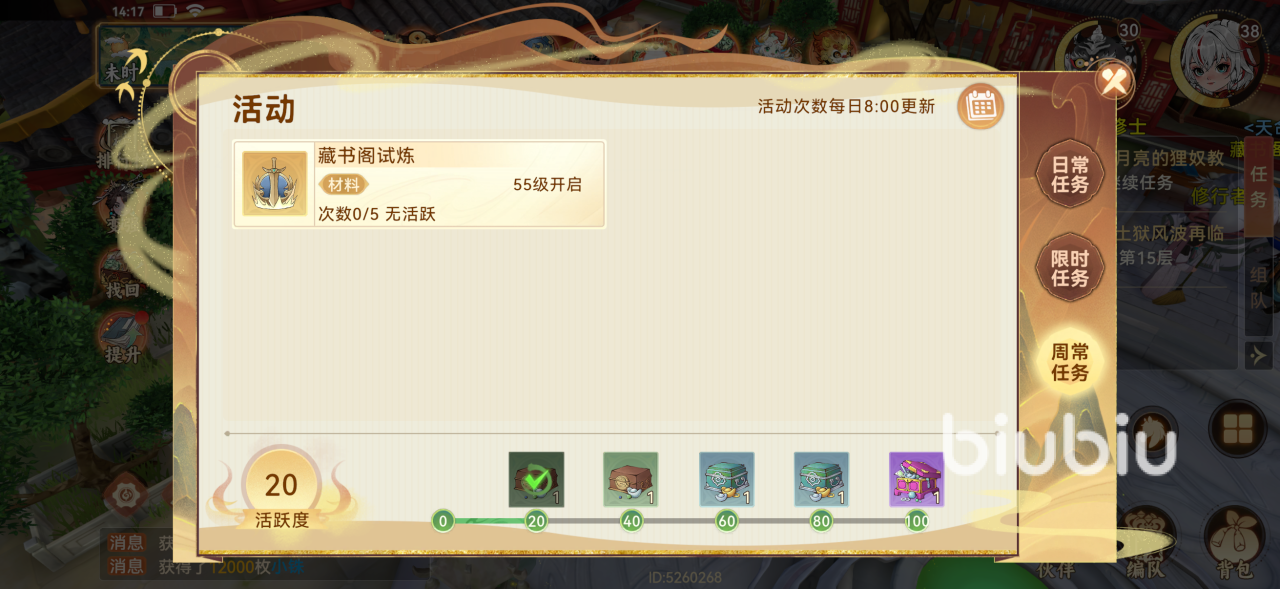 4、通过完成的日常任务和限定任务以及周长任务来解锁每日的活跃度,在活跃度宝箱内也会有相关的同心草奖励内容,不过这个方式会有一定的随机性,在数量上也非常随机,建议作为需要少量同心草道具时,作为补充获得方式。