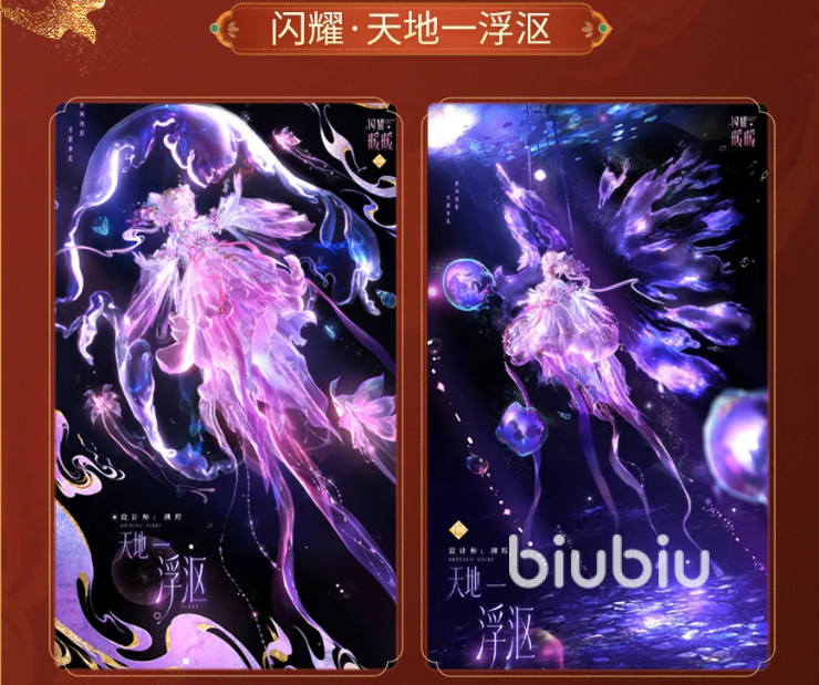 另外两套,“闪耀·天地一浮沤”,“闪耀·朝暮尽千年”,穿戴背饰“羽化梦川”后,能切换泡泡和翅膀2种形态,皮肤是半透明质感,能将皮肤幻化成半透明效果;还原现实中薄膜干涉原理,泡泡与翅膀在不同角度与光线下折射出千变万化色彩。