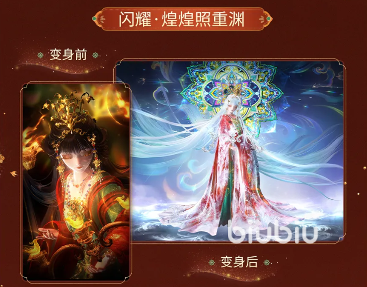 先介绍下限时闪耀服饰,2套云端主题闪耀套装,第一套“闪耀·煌煌照重渊”,第二套是“闪耀·焚寂彻九州”,两套都能多形态切换,具备“神树”、“神女”两种形态,4个实用部件,支持多形态,能随意组合。
