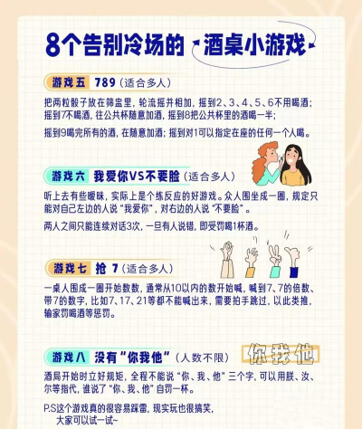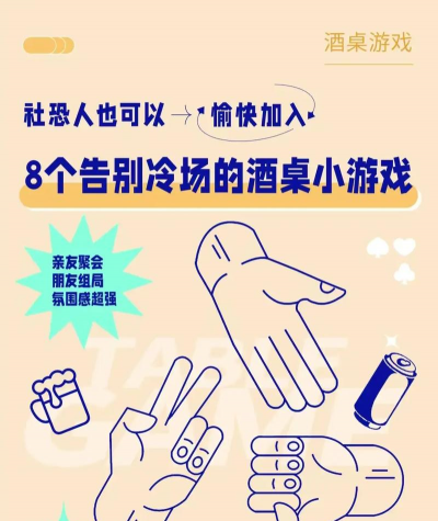 喝得差不多了,可以玩点,轻松不费脑的游戏,“猜拳”就很好,简单直接,输的人喝一小口,或者玩“十五二十”,两个人同时出手,喊出数字,猜对双方数字和的人赢,输的喝酒,这些游戏节奏慢,适合聊天收尾。
