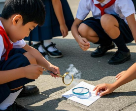 再看阳光聚焦游戏,这个要小心操作,选个晴朗天气,在安全空地,拿张黑色卡纸,用放大镜对准阳光,调整角度和距离,纸上会出现光斑,光斑越来越小,越来越亮,最后冒出白烟,纸被烧出小洞,孩子会很惊讶,但务必注意安全,必须有大人陪同。