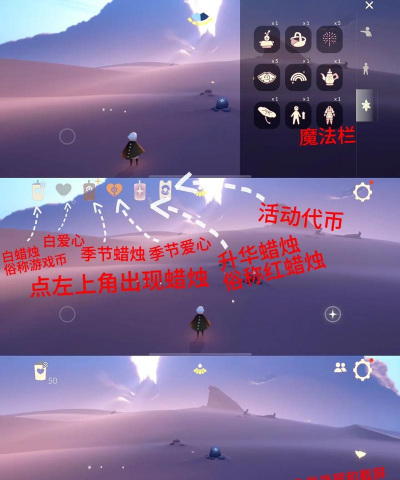 和人物互动,主要为了收集,收集他们的动作,还有爱心,爱心很重要,可以兑换物品,比如好看的斗篷,或者乐器,每个先祖,都有独特的动作树,你需要用蜡烛解锁,蜡烛通过跑图获得,每天收集烛火,就能合成蜡烛,所以,多跑图是关键,解锁的动作越多,你的角色就越丰富。