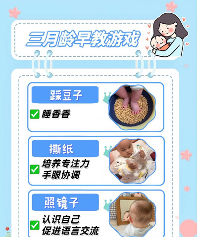 很多新手爸妈会问,三月龄可以玩什么游戏呢,其实,这个月龄的宝宝,已经能和你互动了,他们的小手会抓握,眼睛会追视,对声音也更敏感,所以,选对游戏很重要,不仅能逗乐宝宝,更能促进他们的成长,今天,我们就来聊聊,适合三月龄宝宝的那些小游戏。
