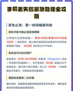 先看第一步,立刻挂失手机卡手机一丢,最怕别人用你的卡,所以第一步要快,赶紧联系运营商,移动就打10086,联通打10010,电信打10000,告诉他们情况,要求立刻挂失SIM卡,这样原卡就失效了,别人没法接收验证码,接着带上身份证,去营业厅补办新卡,号码还是原来的,但旧卡就作废了。