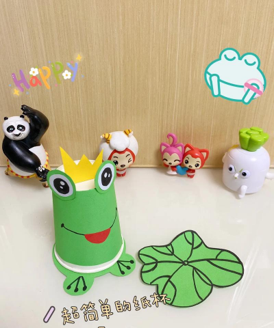 再看制作步骤第一步,先给纸杯穿衣服,把纸杯外面涂成绿色,晾干就好,第二步,剪出青蛙的眼睛,用卡纸剪两个大圆,再剪两个小圆,粘在一起,第三步,做出青蛙的腿,剪四条长条,折一下,粘在杯底,贴上眼睛和嘴巴,一只小青蛙就做好了。