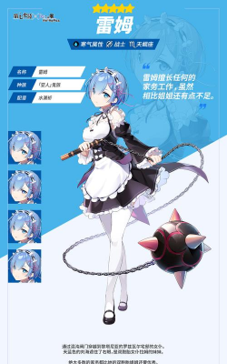 然后说具体作品有一款手游,名字叫《Re:从零开始》,它就收录了雷姆,在这游戏里,你能重温,动漫的经典剧情,也能用雷姆,组成你的队伍,去完成各种任务,体验她的故事。