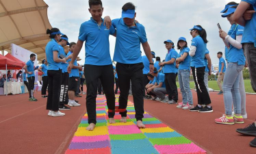 然后是指压板搬运工这个游戏需要一点策略,两人一组,面对面站好,中间放一块指压板,你们需要用额头,或者背部夹住它,然后一起移动到终点,过程中指压板不能掉落,这个游戏非常考验默契,因为指压板表面不平,夹起来本来就费劲,还要协调步伐,很容易出洋相,现场笑声肯定不断。