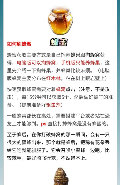 其实,获得蜂蜜的方法,主要有两种,第一种,是去野外寻找蜂巢,地图上,有些地方有野生蜂巢,你可以直接去采集,不过,要小心蜜蜂攻击,第二种,是自己养蜜蜂,你需要先驯服一只女王蜂,然后,给它建个蜂房,这样,就能定期收获蜂蜜了,自己养蜂,虽然麻烦点,但是,产量稳定很多。