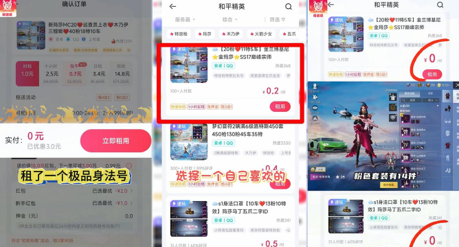 租号的时候,你会看到,各种不同的账号,有的账号,等级很高,装备很全,有的账号,可能只有某个稀有皮肤,价格当然也不同,你要想清楚,自己到底想体验什么,如果只是想试试手感,那租个普通号就行,如果想炫耀一下,那就得选个豪华号。