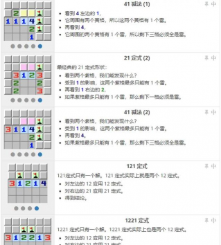 游戏的核心,就是看数字,然后推理,比如,一个格子显示“1”,就表示,它周围的八个格子中,有且仅有一颗雷,如果它周围,已经有一个格子,被标记为雷了,那么,剩下的格子,就都是安全的,可以放心点开,再比如,一个格子显示“2”,周围有两个格子,已经被你怀疑是雷了,那么,剩下的格子,也是安全的,这个推理过程,需要你仔细观察,慢慢练习。