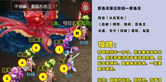 先看队伍配置,这是基础,也是关键,打章鱼王,队伍搭配很重要,我建议带两个输出,一个辅助,再加一个封系,输出负责清小怪和打伤害,辅助要能加血和解状态,封系的任务,就是控制住章鱼王的关键技能,让它放不出大招。