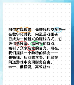 你是不是也想在问道里搬砖,但又不知道从何下手,其实,很多新手都有这个想法,毕竟,谁不想赚点元宝呢,今天,我们就来聊聊这个话题,希望能给你一些启发。