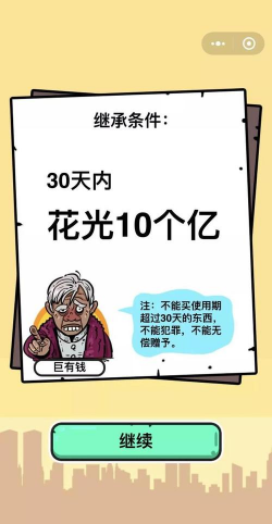 先看游戏的核心玩法,这游戏的目标很明确,就是让你在规定时间内,把钱全部花光,听起来简单吧,但实际操作起来,你会发现,花钱也不是那么容易的事,因为游戏里设置了很多限制,比如不能乱投资,不能无脑送钱,你得找到那些,既合法又高效的烧钱方式。